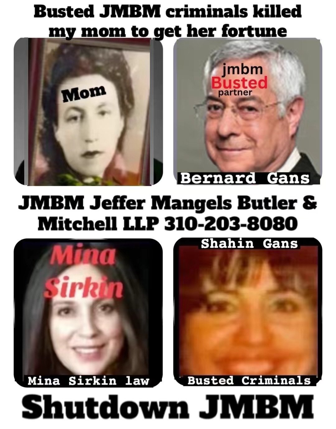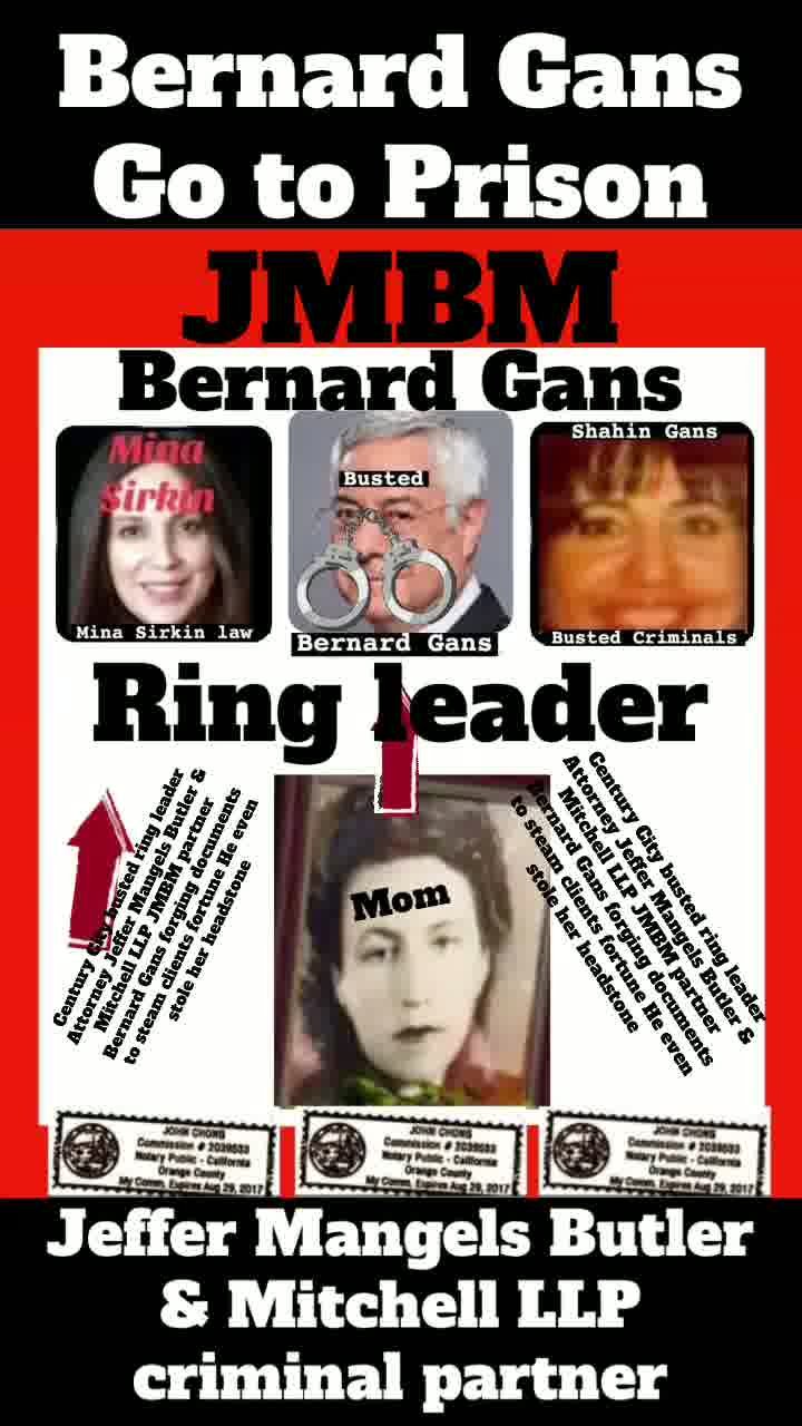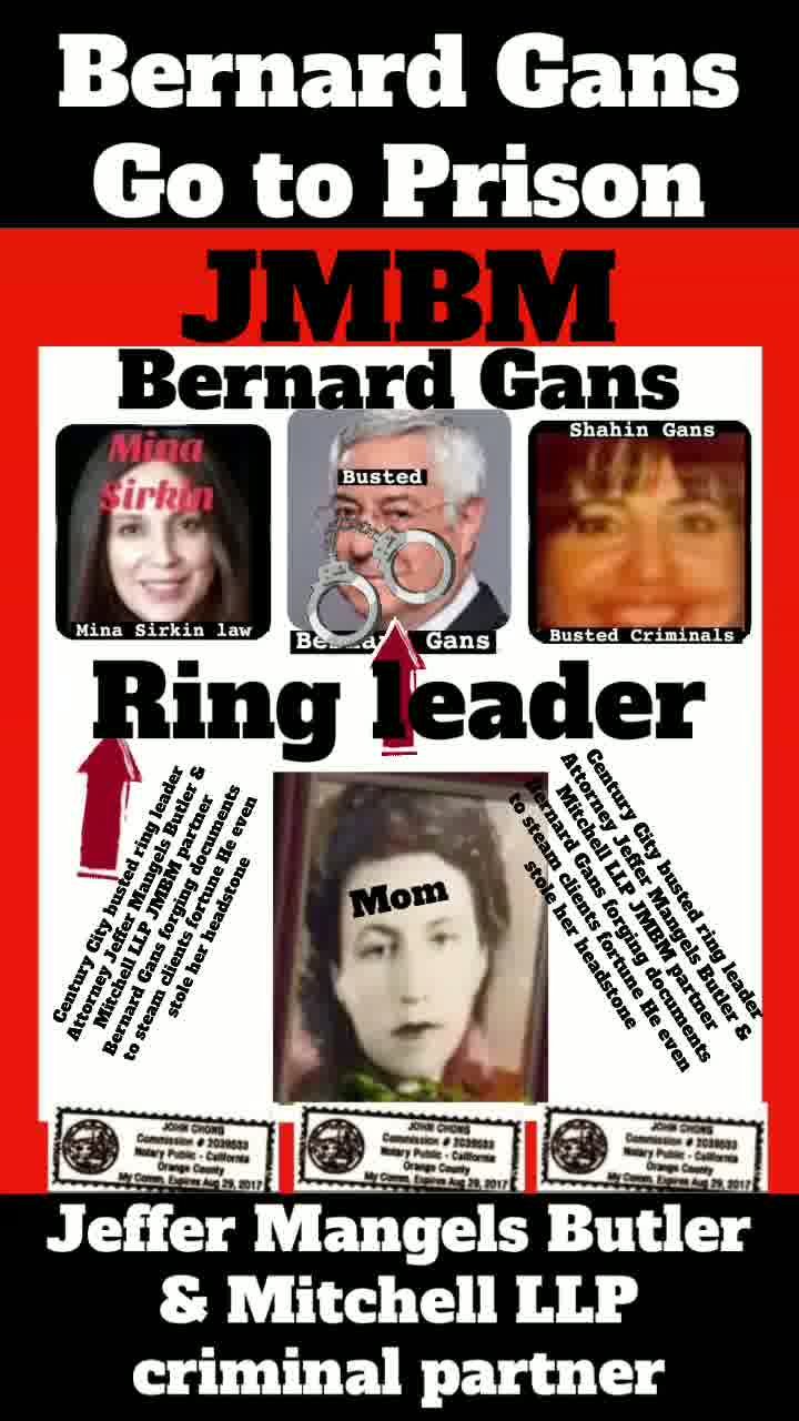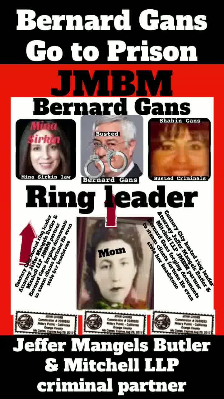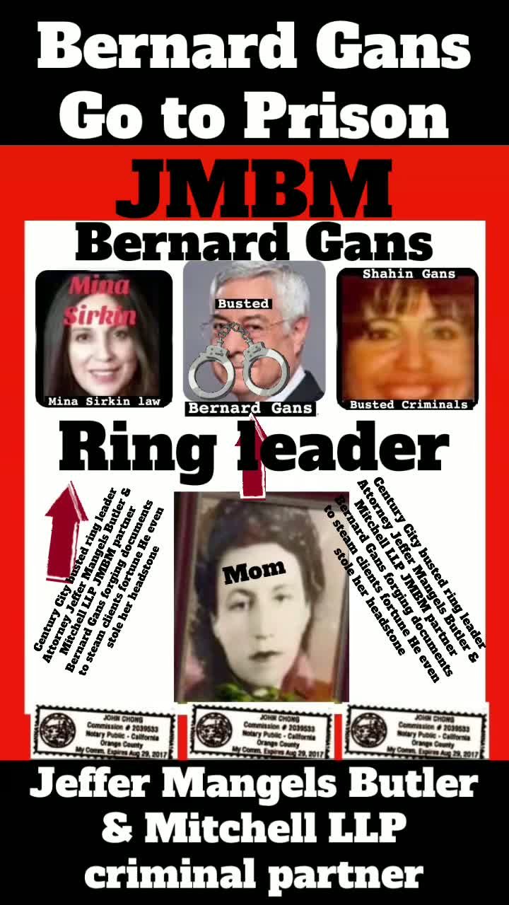 Suing JMBM partner $500,000,000,000.00 Busted criminal attorneys Jeffer Mangels Butler & Mitchell LLP lawyer Bernard Reginald Gans #57068 Bernard Gans Mina Sirkin law group JMBM killed my mom to get her fortune.Suing JMBM partner $500,000,000,000.00 Busted criminal attorneys Jeffer Mangels Butler & Mitchell LLP lawyer Bernard Reginald Gans #57068 Bernard Gans Mina Sirkin law group JMBM killed my mom to get her fortune.