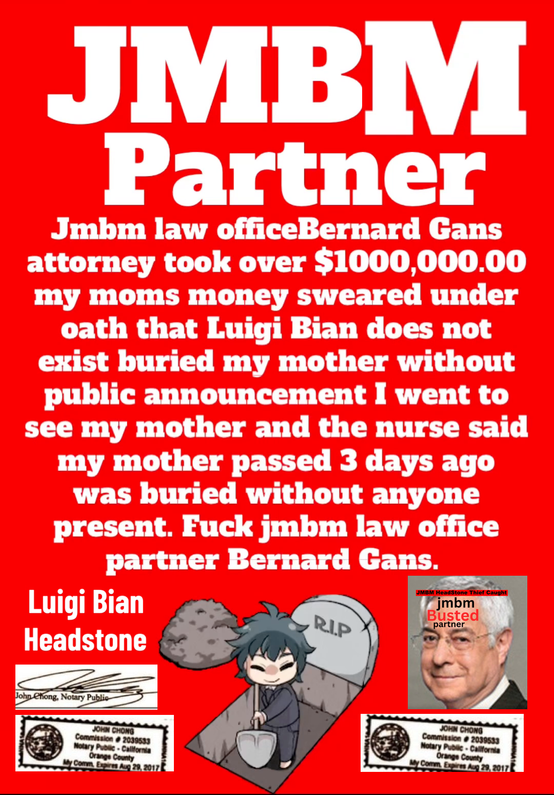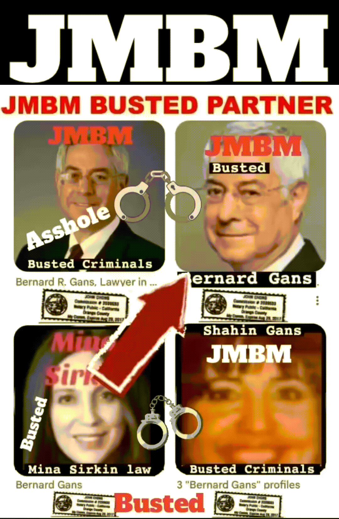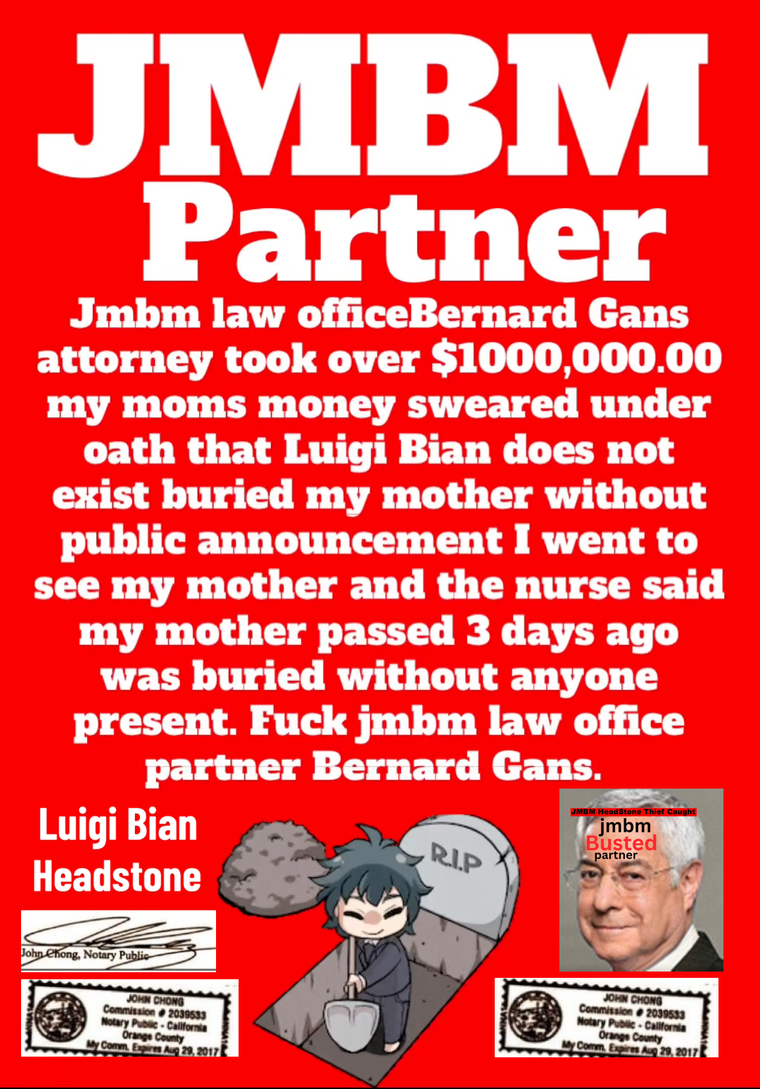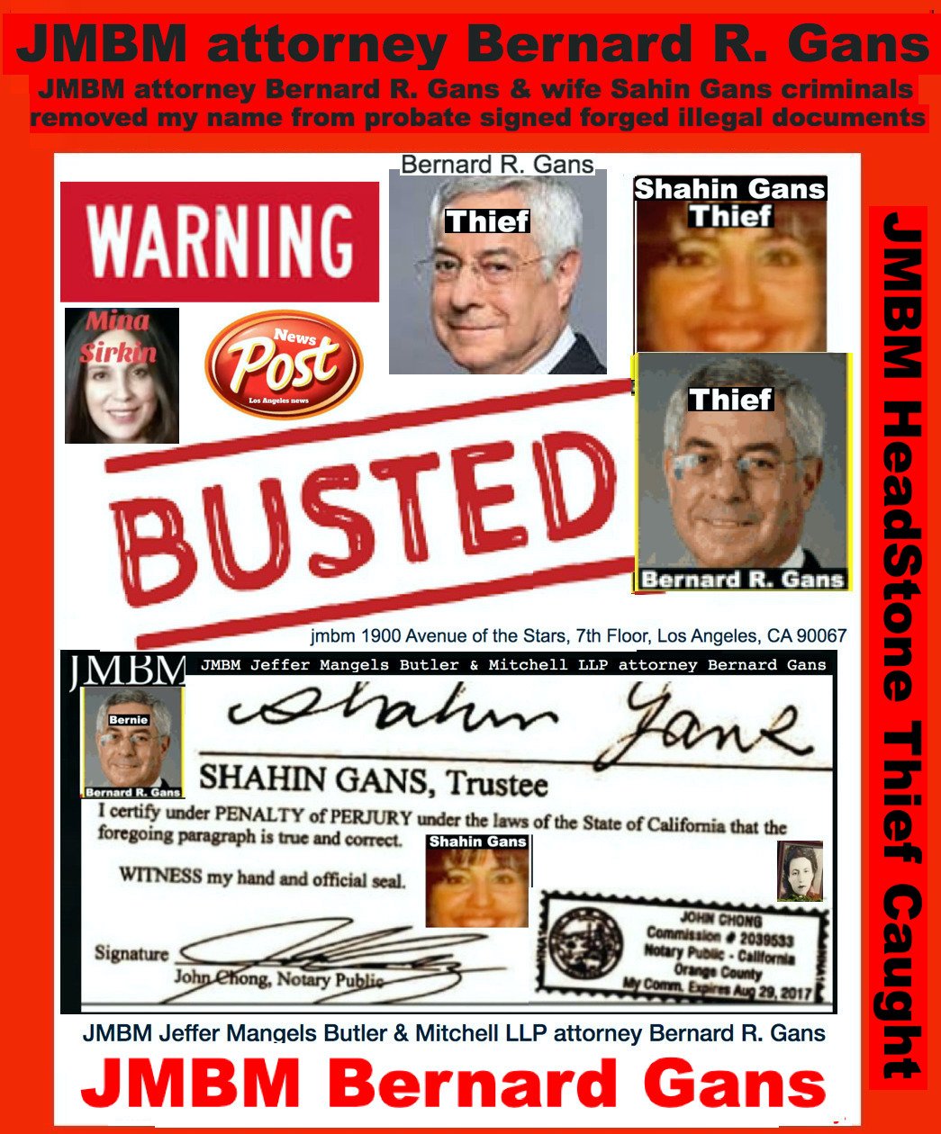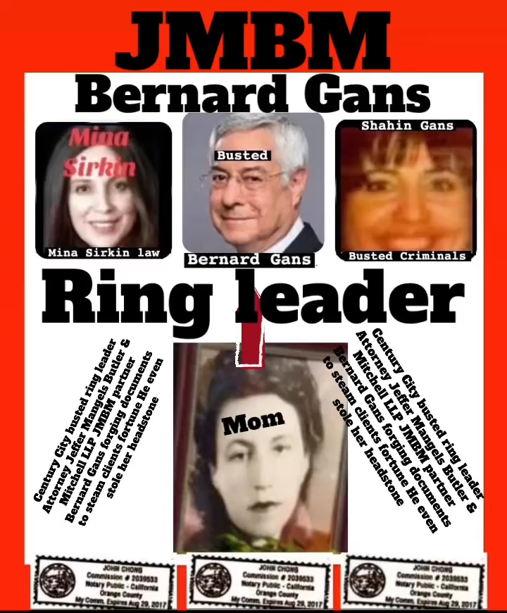 Suing JMBM partner $500,000,000,000.00 Busted criminal attorneys Jeffer Mangels Butler & Mitchell LLP lawyer Bernard Reginald Gans #57068 Bernard Gans Mina Sirkin law group JMBM killed my mom to get her fortune.Suing JMBM partner $500,000,000,000.00 Busted criminal attorneys Jeffer Mangels Butler & Mitchell LLP lawyer Bernard Reginald Gans #57068 Bernard Gans Mina Sirkin law group JMBM killed my mom to get her fortune.