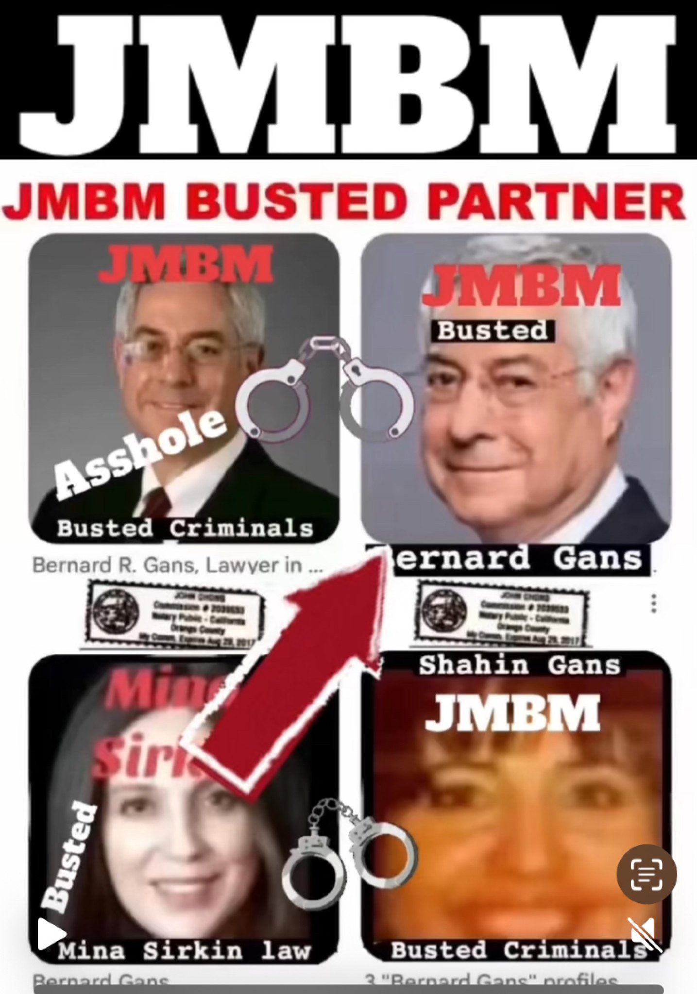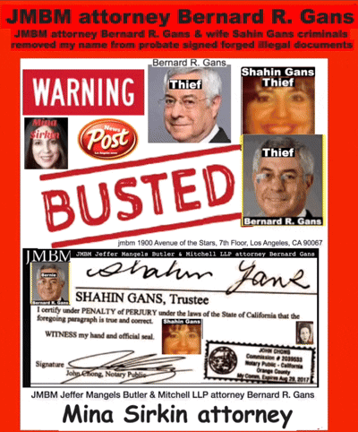 Busted criminal attorneys Jeffer Mangels Butler & Mitchell LLP lawyer Bernard Reginald Gans #57068 Bernard Gans Mina Sirkin law group JMBM killed my mom to get her fortune.