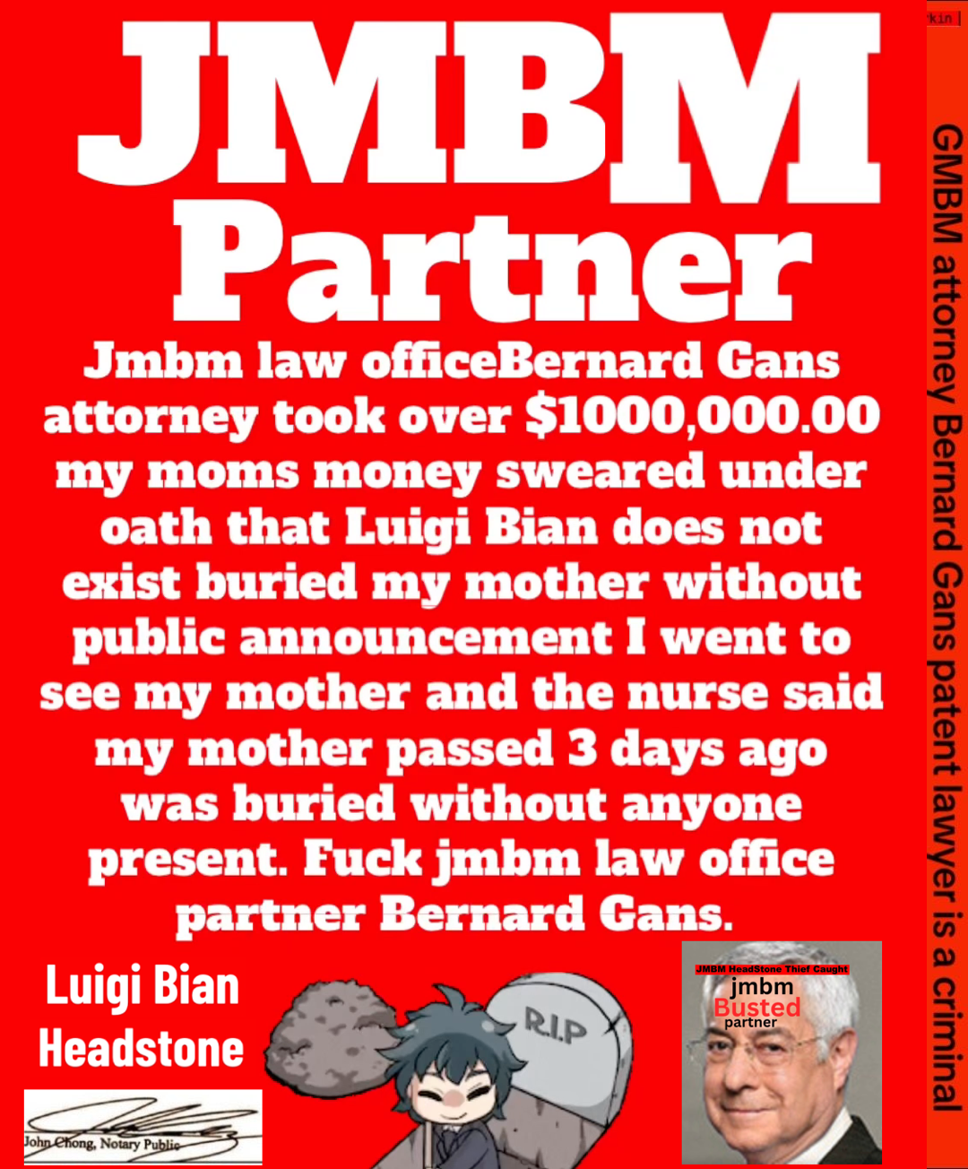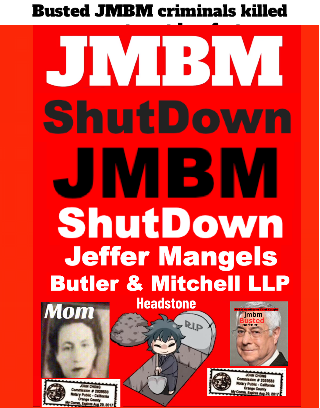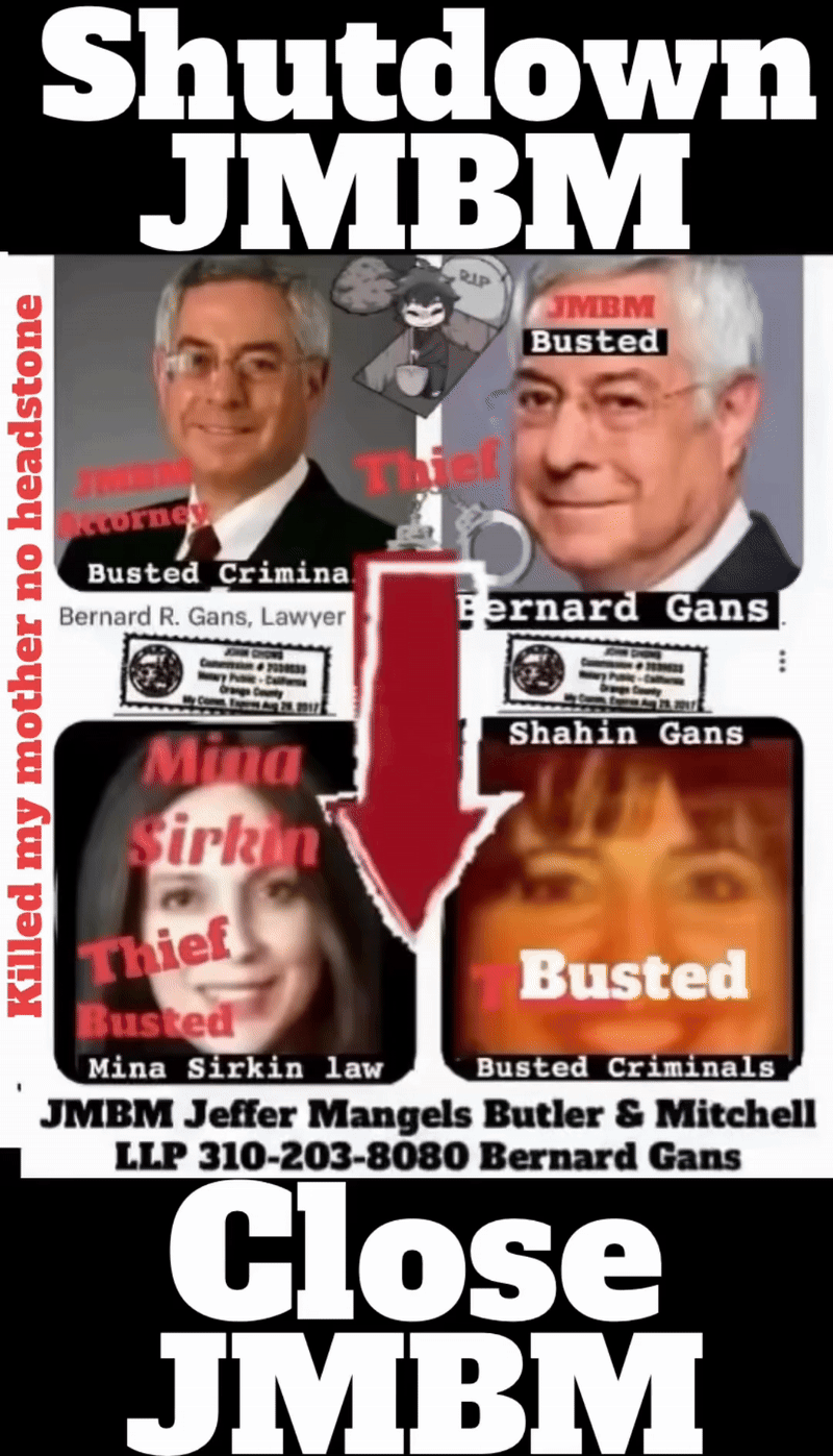 Suing JMBM partner $500,000,000,000.00 Busted criminal attorneys Jeffer Mangels Butler & Mitchell LLP lawyer Bernard Reginald Gans #57068 Bernard Gans Mina Sirkin law group JMBM killed my mom to get her fortune.Suing JMBM partner $500,000,000,000.00 Busted criminal attorneys Jeffer Mangels Butler & Mitchell LLP lawyer Bernard Reginald Gans #57068 Bernard Gans Mina Sirkin law group JMBM killed my mom to get her fortune..